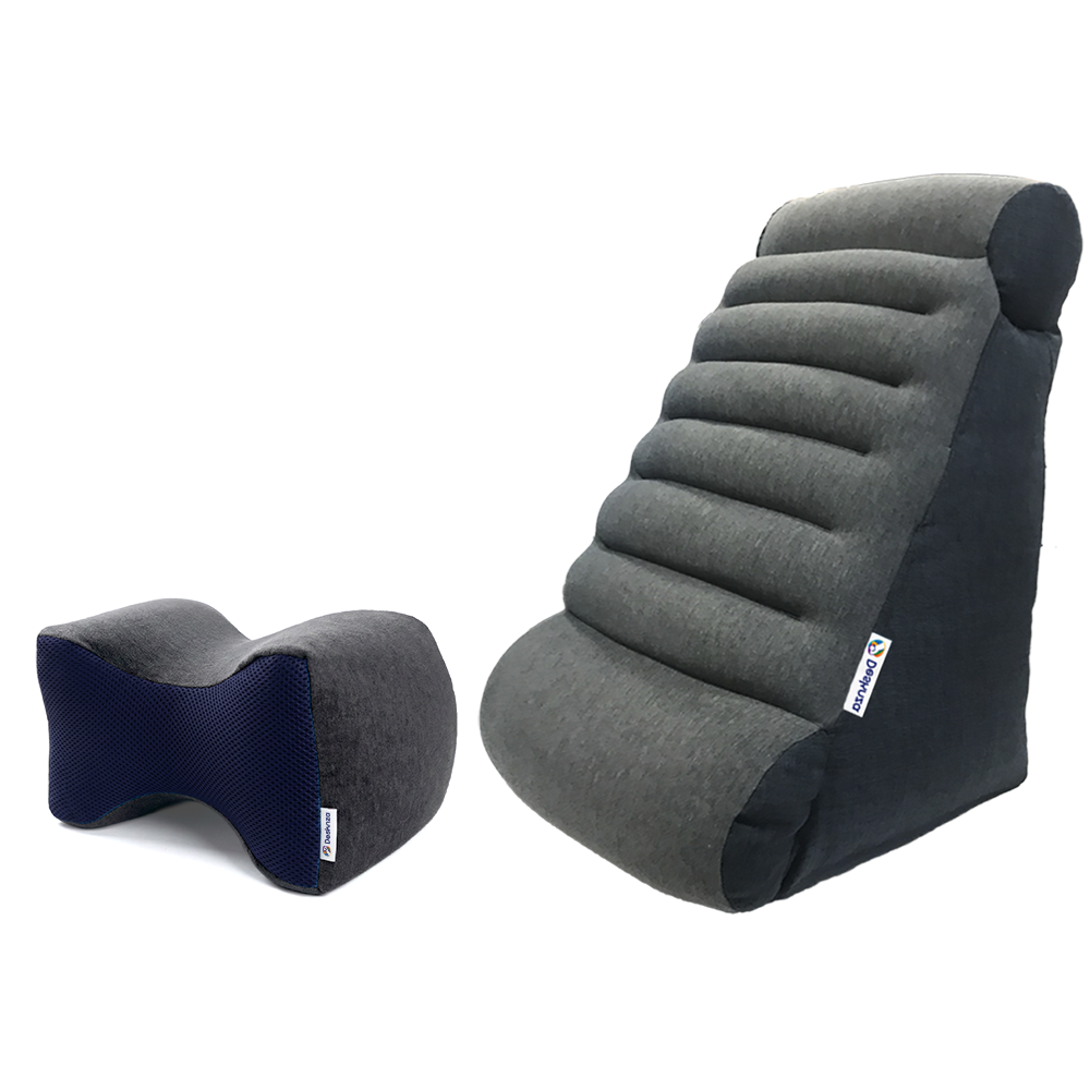 Combo perfecto para cuidarse mientras se relaja. Brindando soporte firme con su forma triángular y ergonómica para la espalda, más un cojín multiusos que permite mayor comodidad.